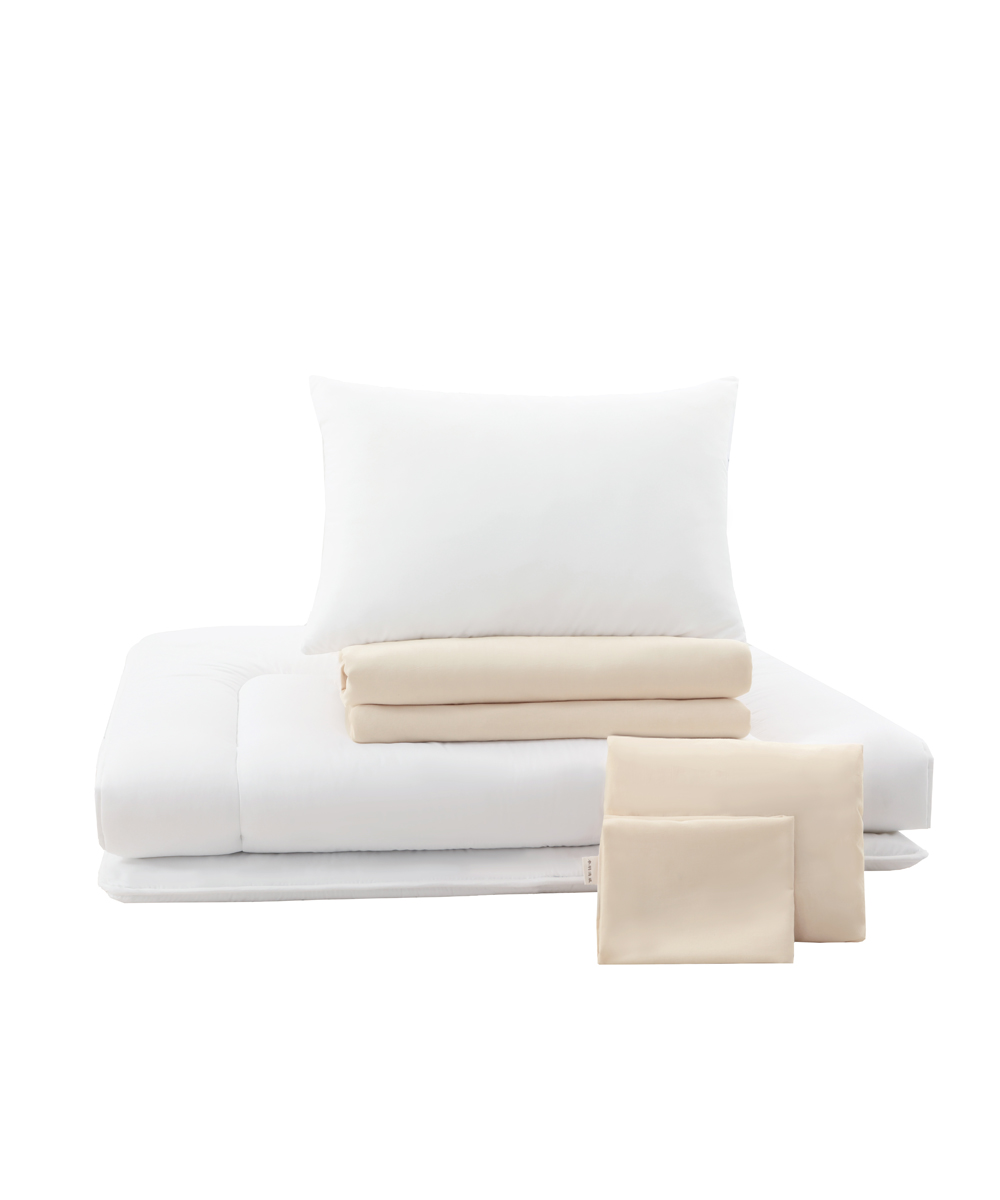セット内容:枕カバー×1、敷き布団カバー×1、掛け布団(カバー一体型・中綿入り)×1、枕(中綿入り)×1、三つ折り敷き布団×1、専用収納バック×1。新生活やゲストルーム、ギフトにもぴったりです。